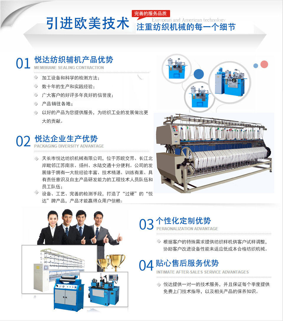 公司是主要生產紡織平車安裝工具、紡部輔件及配件綜合性企業。已有二十多年的生產歷史,在激烈的市場競爭中始終保持優良的質量、優化的價格、齊全的品種優勢。產品暢銷全國各地,深受新老客戶的好評。